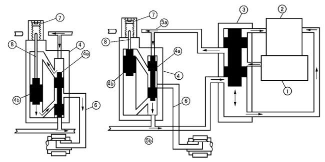 1、润滑泵;2、贮油器;3、换向阀;4、分配器;4a、先导活塞;4b、主活塞