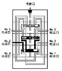 5、流入的润滑剂推动活塞C向右移动、右腔的润滑剂压向NO.4吐出口经外部配管送向润滑点。当活塞C运动至右极限时活塞B左腔开始进入润滑剂。