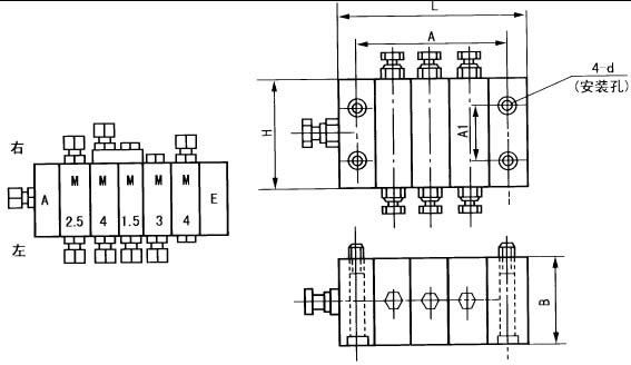 | 说明:递进分配器的组合按进油口元件首块A、工作块M和尾块E、从左到右排列,在队列下方出口称为左,在队列上方出口称为右。如图 |