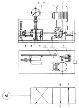 电动机经蜗轮蜗杆减速后,由偏心轮2带动连杆3 作直线往复运动。由于连杆末端所连动的弹簧机构4的作用,使二位四通阀5中的滑芯杆6产生急速的推拉动作,从而改变二位四通阀各油口的联接方式,达到液流换向的目的。此时,偏心轮旋转了180°到达另一个死点位置,触动了限位开关7。限位开关即可送出脉冲信号,停止阀电机运行,完成了一个工作过程。压力表8装于防护罩9顶部用于监视阀内的工作压力。