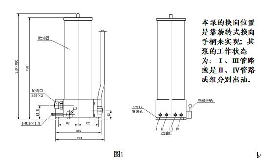油泵给油的换向是通过手动操作换向手柄来达到目的,当换向手柄转动到一个定位孔时,润滑脂将主油管II供送润滑脂,当把换向手柄转动到另一个定人位孔时,润滑脂经主油管I供送润滑脂。任一状态时另一主油管I,II分别卸荷与贮油器连通。
